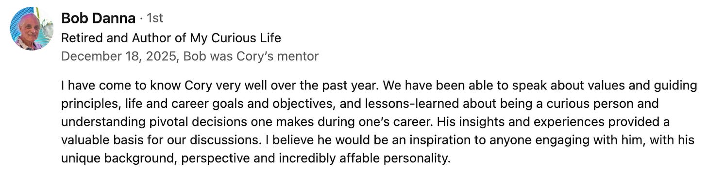 Current availability: Reach out about your situation, & we’ll see if it’s a good fit (either message me on LinkedIn or email me at Coryvgerlach@gmail.com).